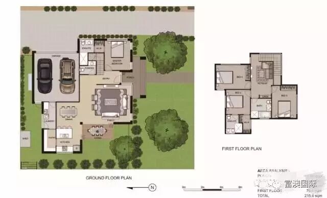 Unit 1:四房3.5卫双车库的户型,总建筑面积为216平方米,楼上楼下都带宽敞客厅,占地约315平米。